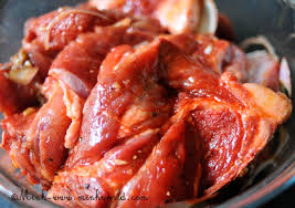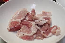 - Thịt ba chỉ rửa sạch, cắt lát nhỏ vừa ăn, ướp vào bát thịt nửa thìa nhỏ muối, hai thìa nhỏ nước mắm, hai thìa nhỏ đường, một ít hạt tiêu, ướp từ 2 đến 3 tiếng để thịt được thấm.
